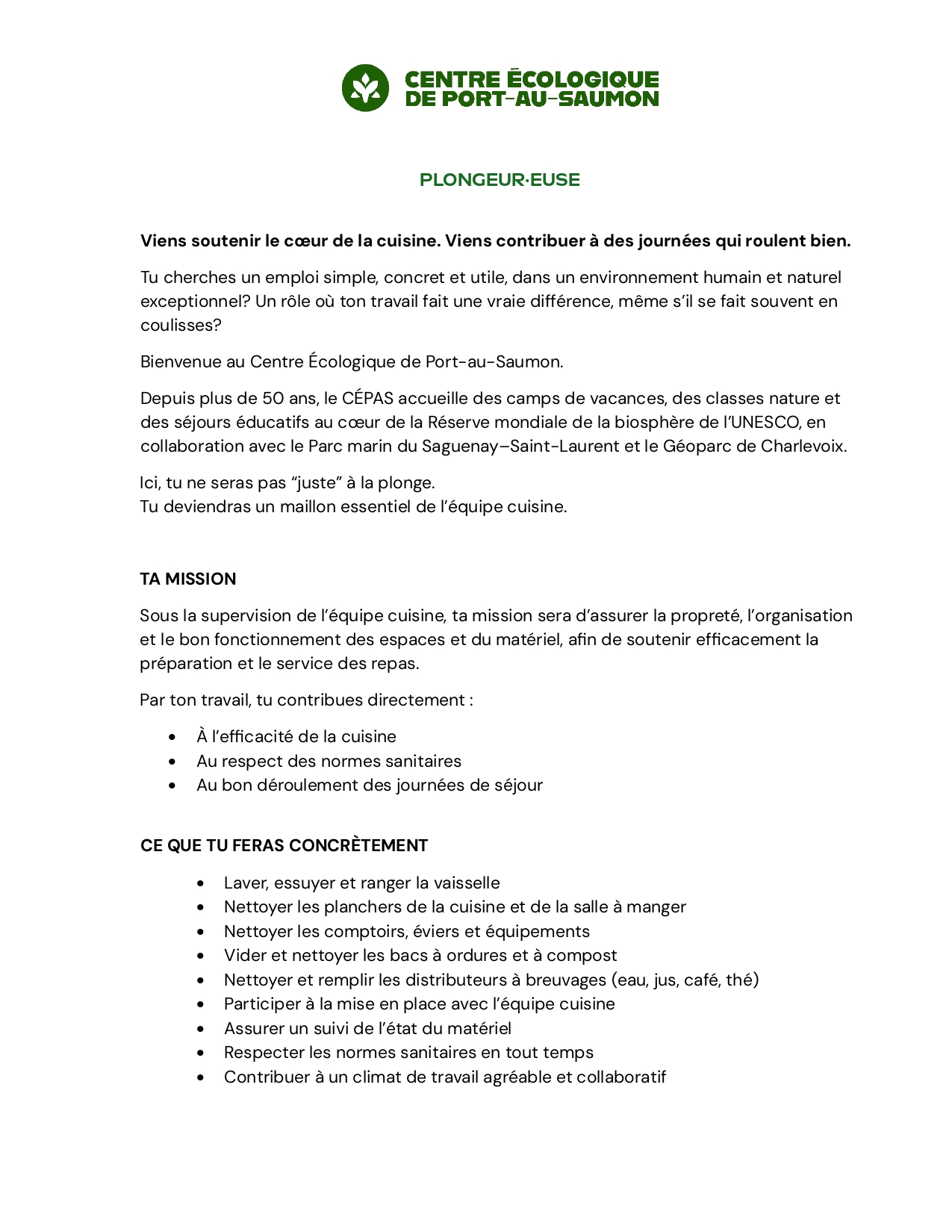 Offre d’emploi – été 2026 : plongeur.euse